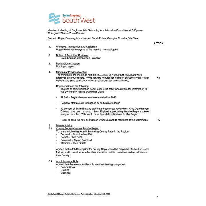 Artistic Swimming Committee Meeting Minutes - 20.08.20 Artistic Swimming Committee Meeting Minutes - 20.08.20
