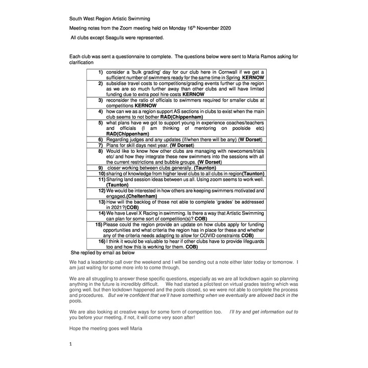 Artistic Swimming Committee Meeting Notes - 16.11.20 Artistic Swimming Committee Meeting Notes - 16.11.20