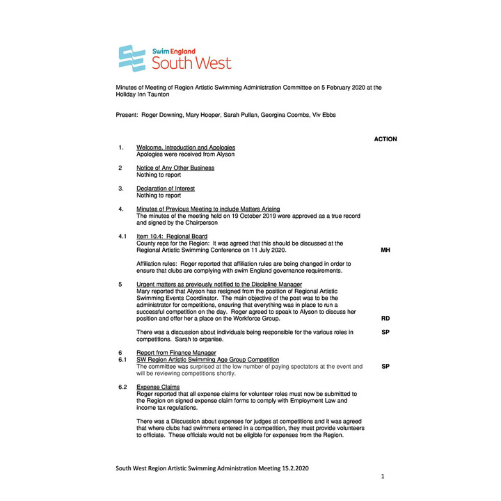 Artistic Swimming Committee Meeting Minutes - 15.02.20 Artistic Swimming Committee Meeting Minutes - 15.02.20