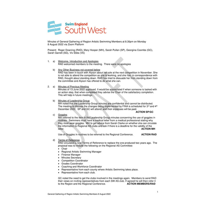 Artistic Swimming Committee Meeting Minutes 08.08.2022 Artistic Swimming Committee Meeting Minutes 08.08.2022