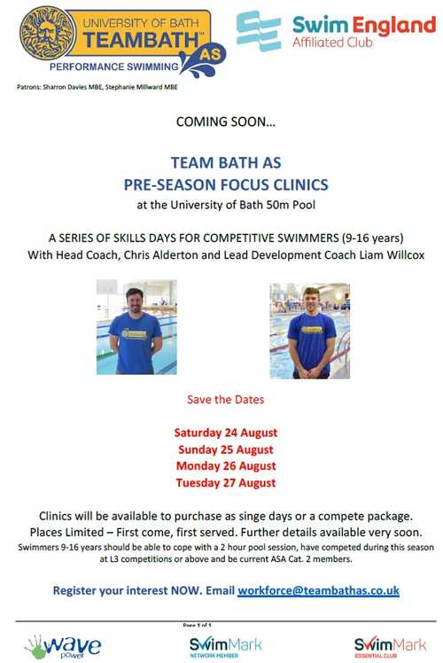 Team Bath AS are advertising a series of pre-season clinics for competitive swimmers over four days in August (24th to 28th), at the University of Bath, giving 9-16 year old swimmers the change to hone skills, technique and technical knowledge in time for the 2019/2020 season. Swimmers can opt for them all or choose individual clinics to attend.